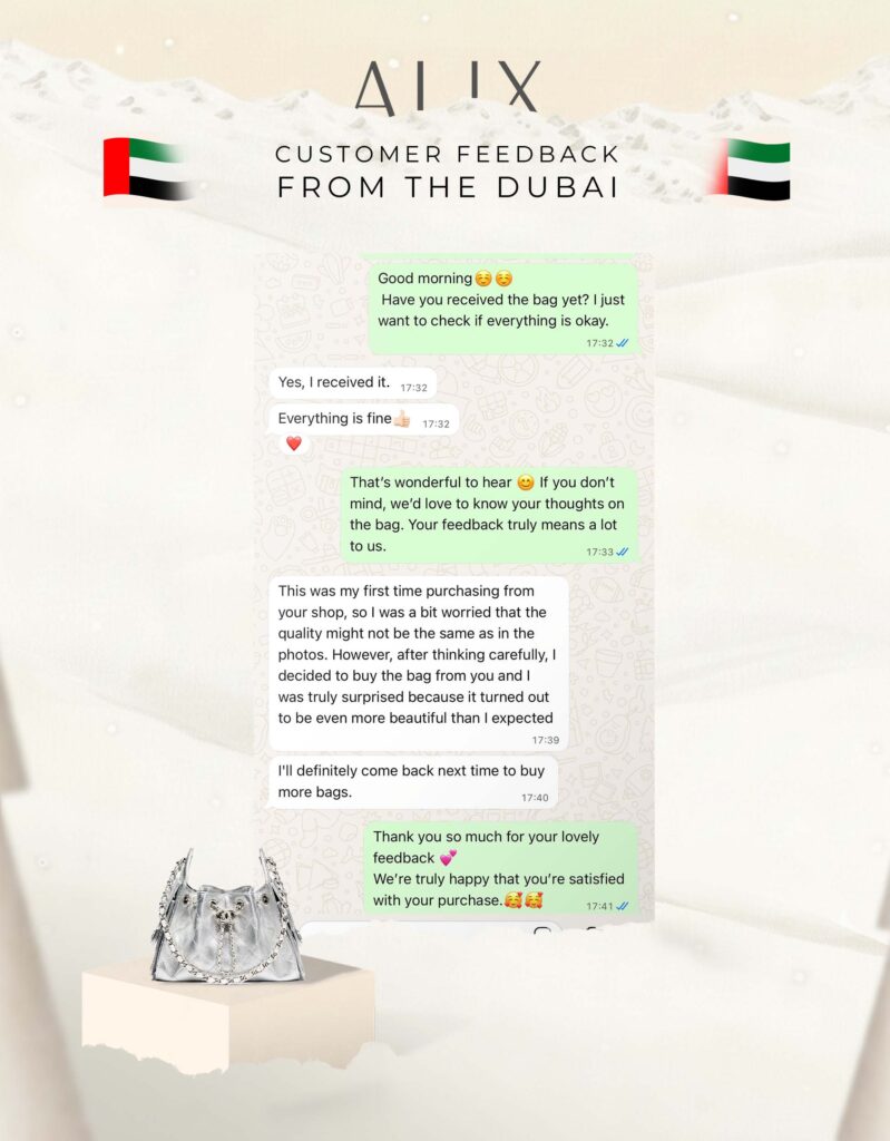 Each bag is fully packaged with boutique-style accessories and delivered through a safe, fast, and fully handled international shipping system, with customs clearance and risk-free policies. In any rare issue, Alix takes full responsibility with refunds or replacements.